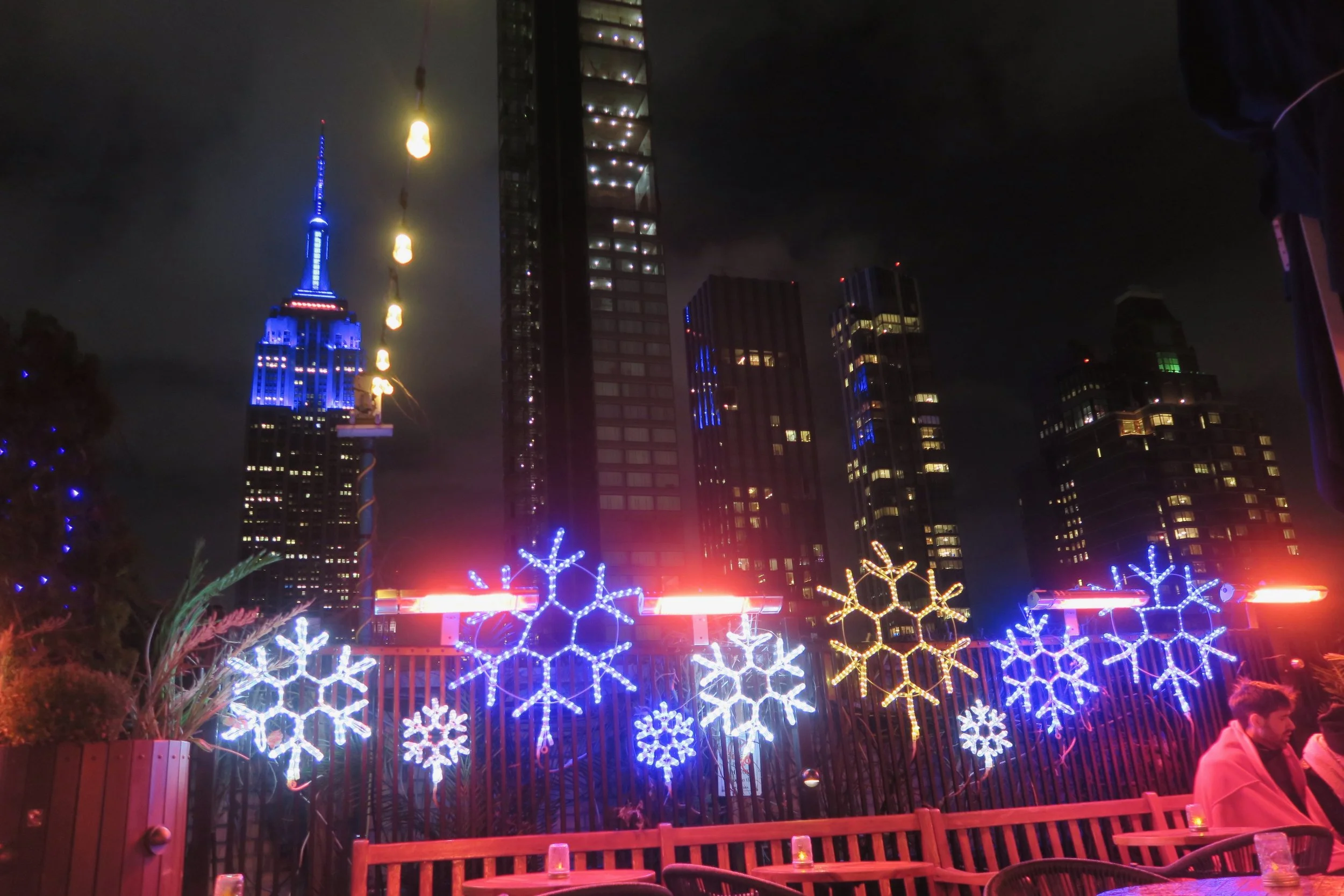 View of Empire State Building from 230 5th roofttop bar during Christmas; November 2024