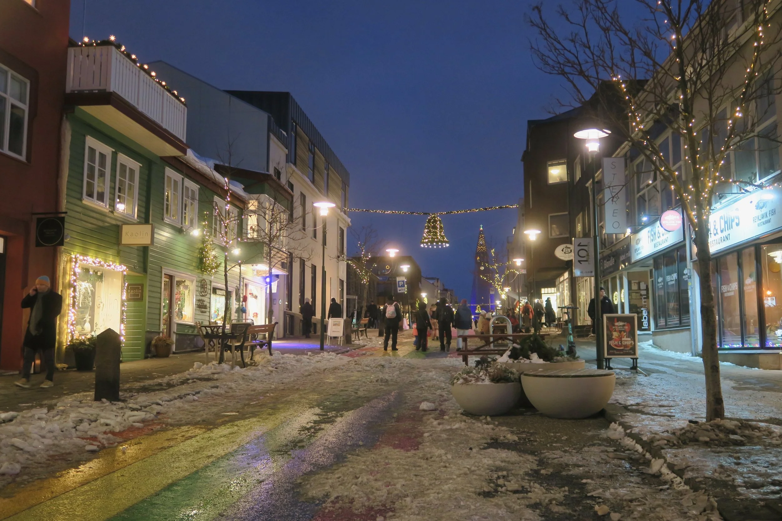 Rainbow street in Reyjkavik, Iceland; December 2022