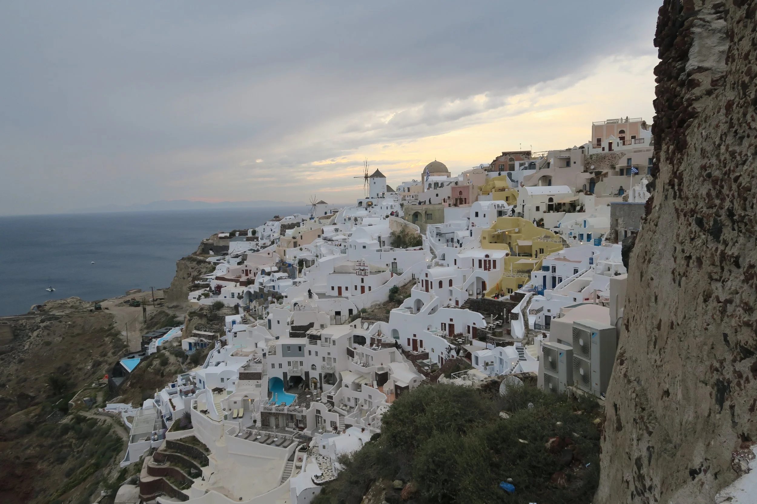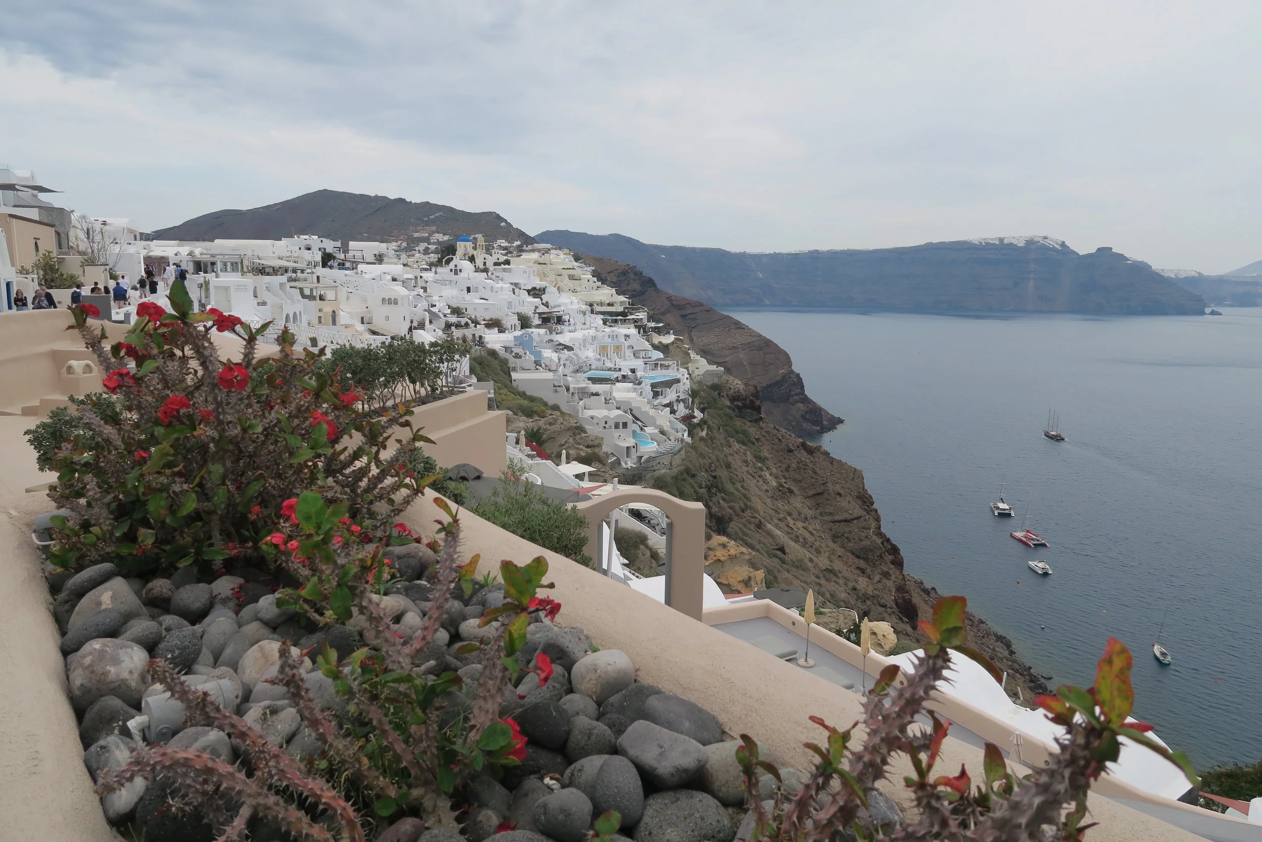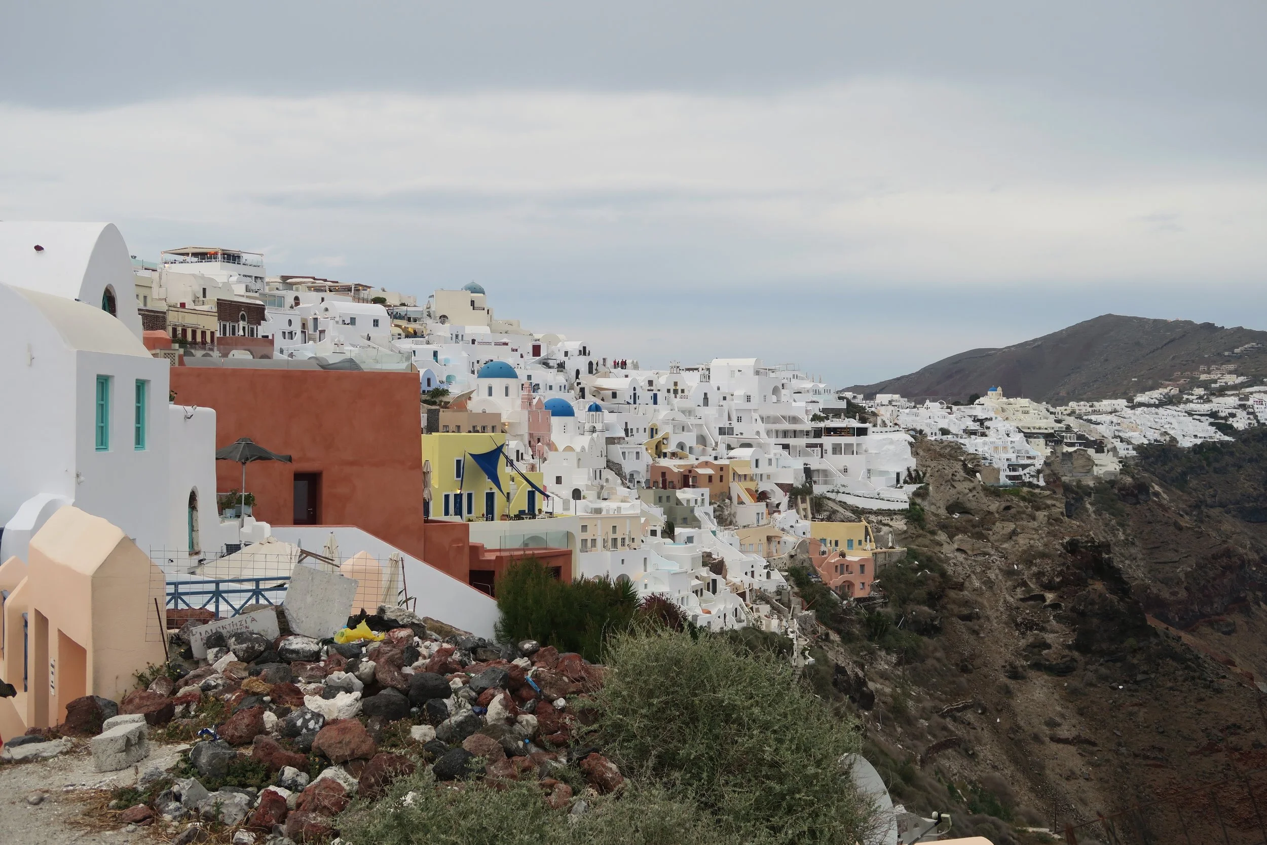 Santorini: Most touristic things are perched above the water, with clifftop views. The towns like Oia and Fira are spread across elevated ridges, meaning more walking and distance between sights. |