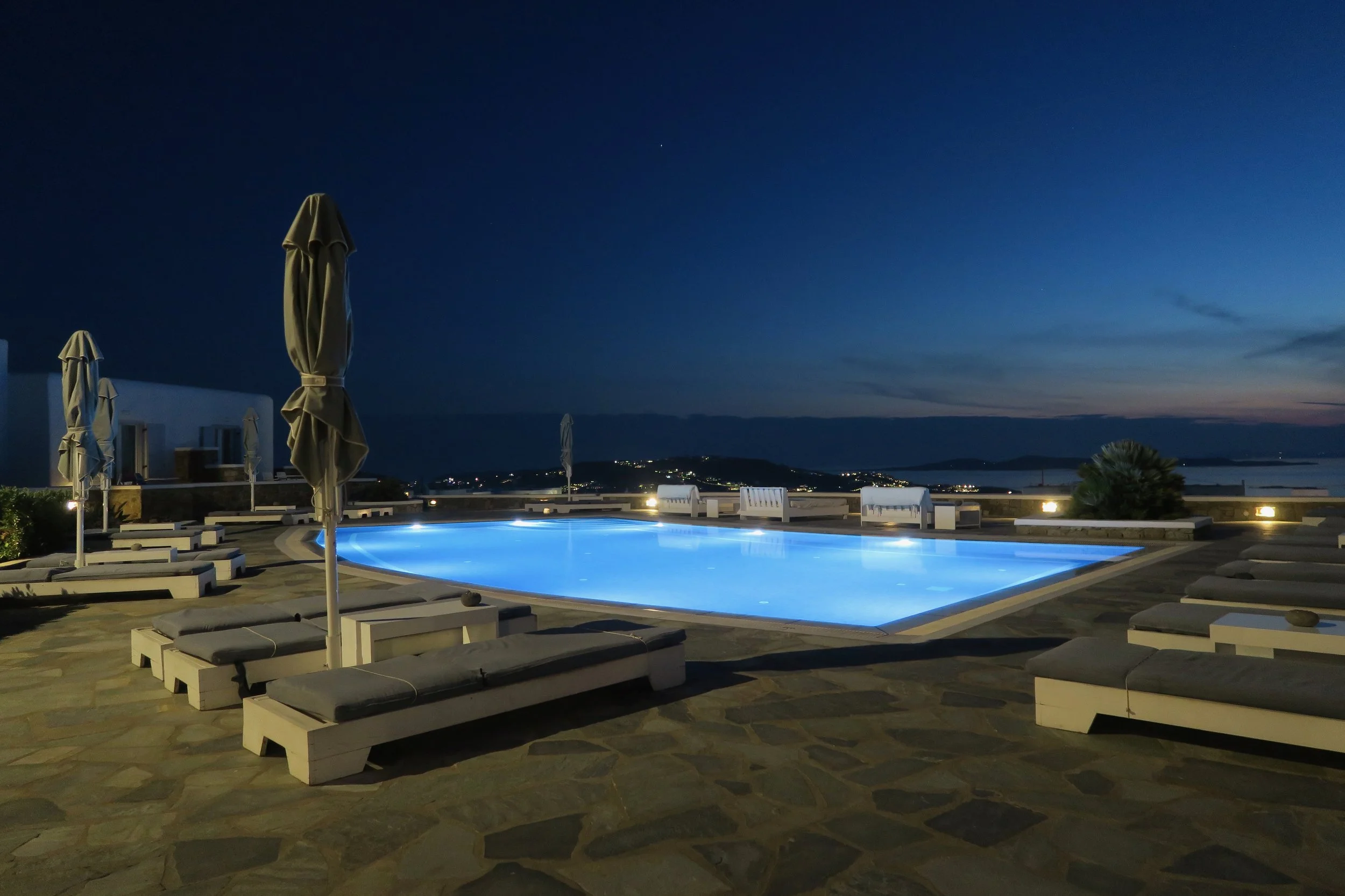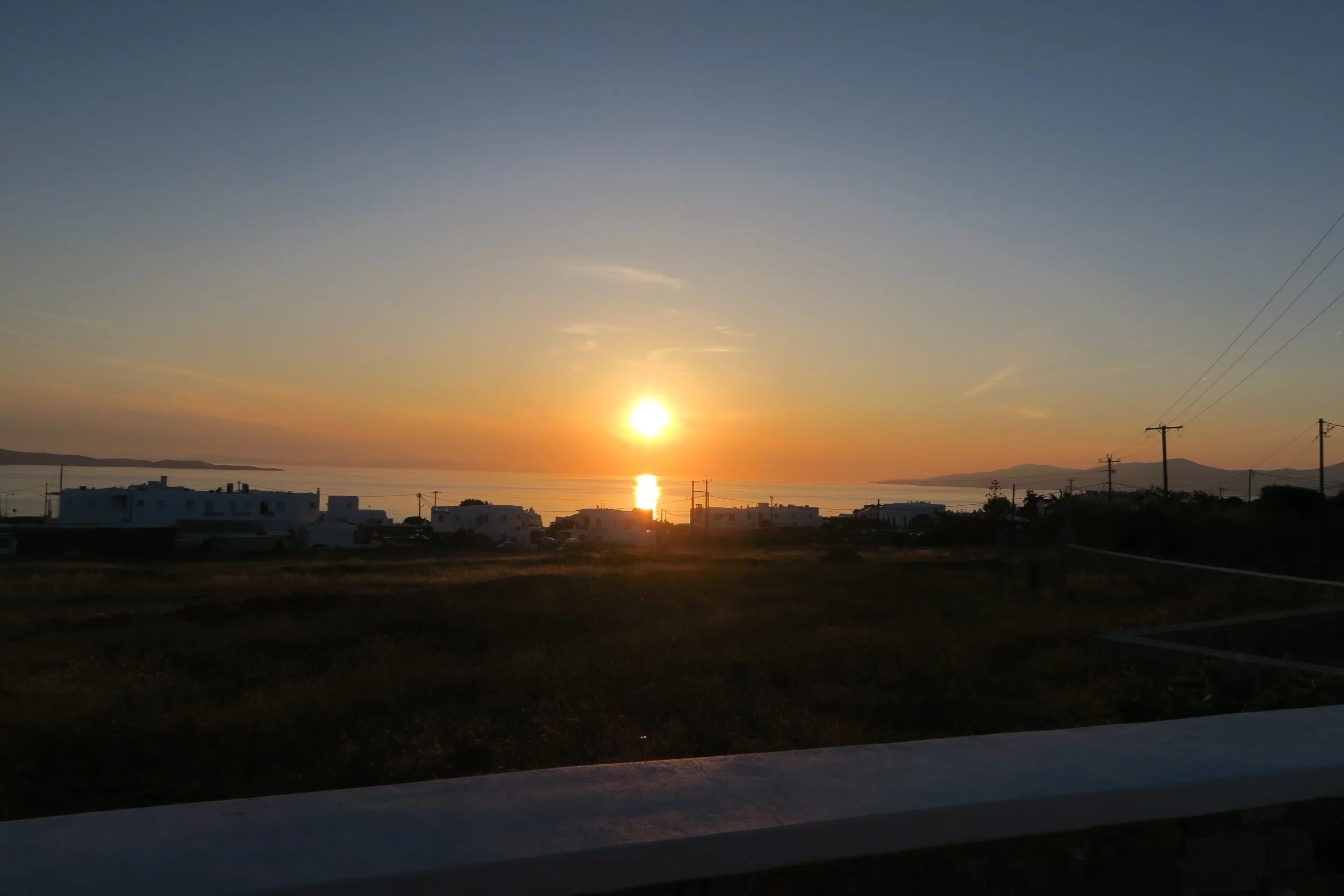 View of sunset in Mykonos from Aeolos Resort; April 2023