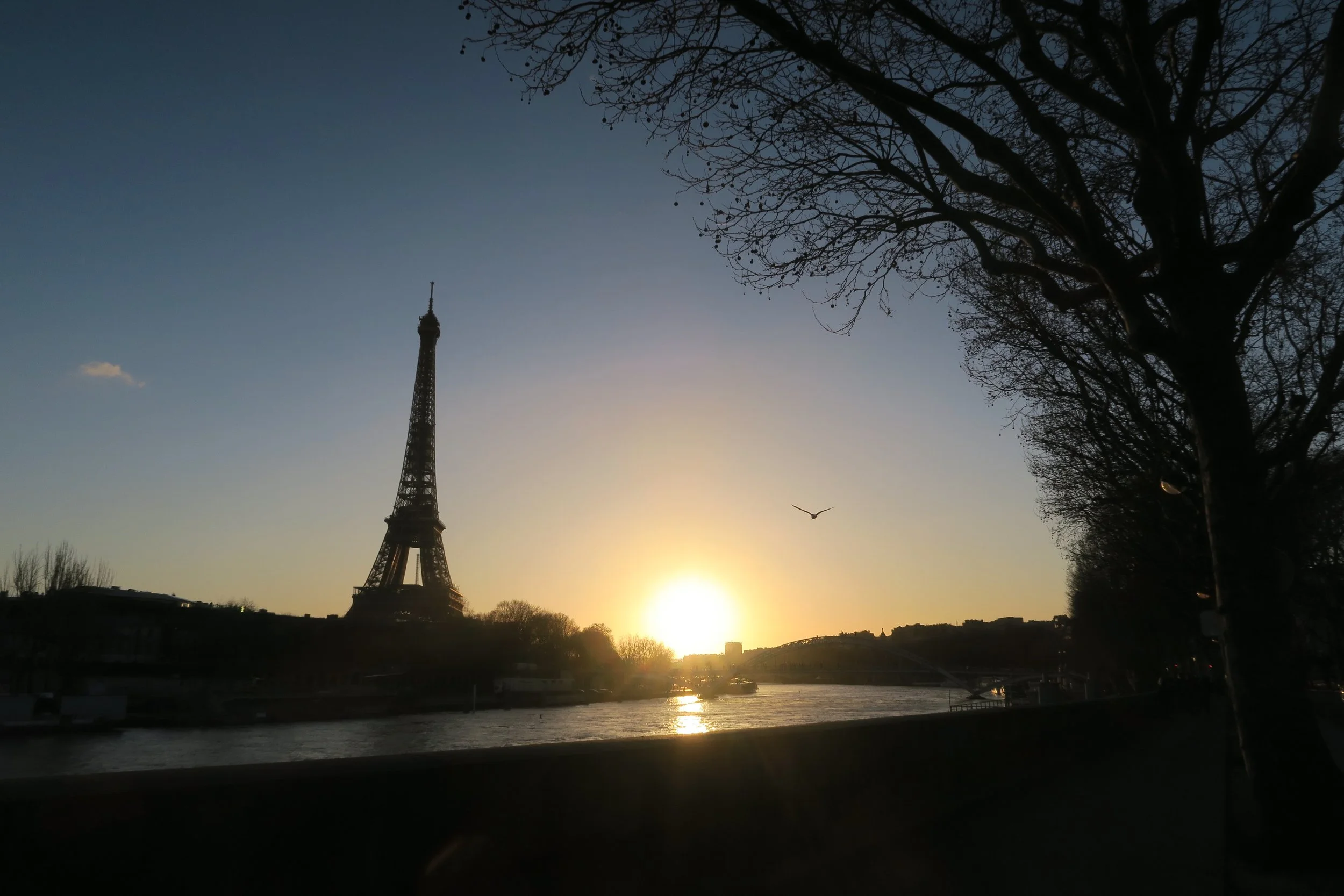 Sunset along the seine with a view of the Eiffel Tower; January 2022